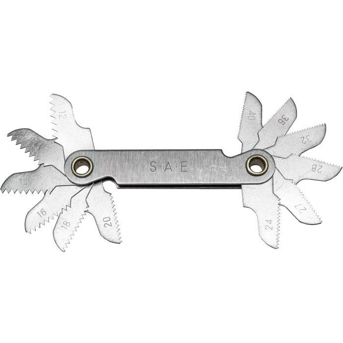 Medidor de roscas de mm/plg con 12 hojas, marca Century Drill modelo 98401.