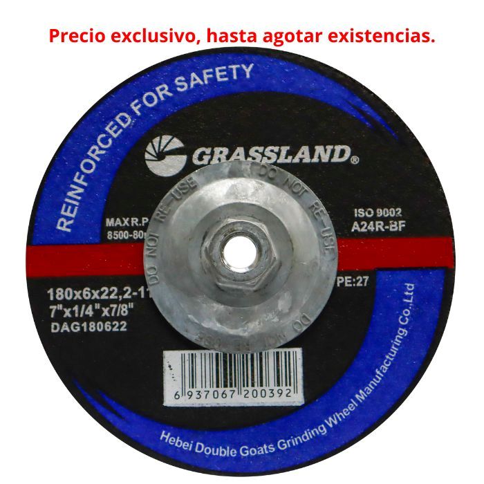 diseñado para el amolado eficiente de acero con amoladora angular. Ofrece alta resistencia, seguridad y desempeño confiable, gracias a su fabricación en óxido de aluminio y refuerzo de fibra de vidrio, ideal para trabajos exigentes en taller e industria.